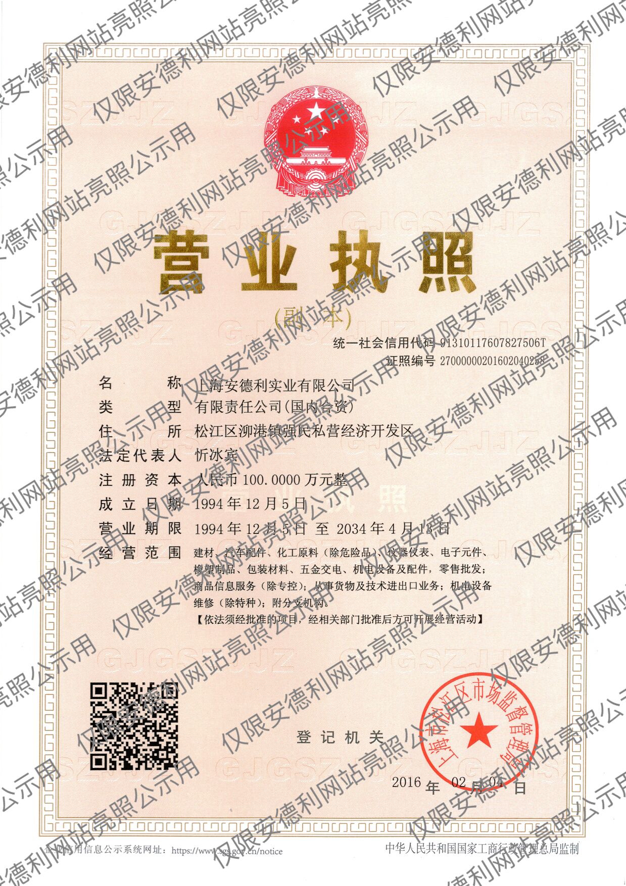 版权所有 2007 上海安德利实业有限公司 营业执照